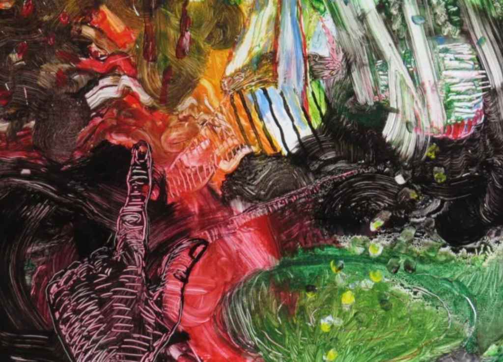 Abstracts in neocolour ill Aquerelle on incised Tyvek (Tyvek: a 100% synthetic material made from high-density spunbound polyethylene fibers)